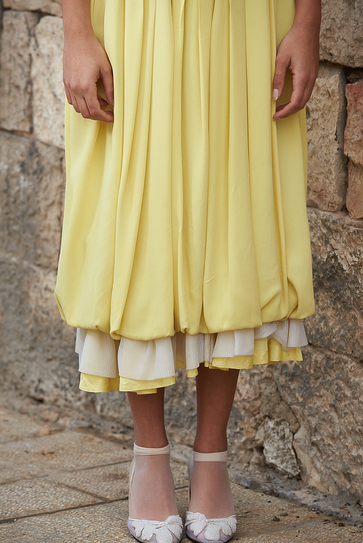 Pierre Balmain’s classic 60’s Volante silk dress with super expandable hem is a timeless vintage dress from the designs of this legendary fashion designer. Crafted from a smooth yellow silk fabric with an elegant rounded neckline, sleeveless and three volante layers that adorn the bottom hem of this beautiful fit & flaring long dress. Ideal for any special occasion, including cocktail parties & dinner events.