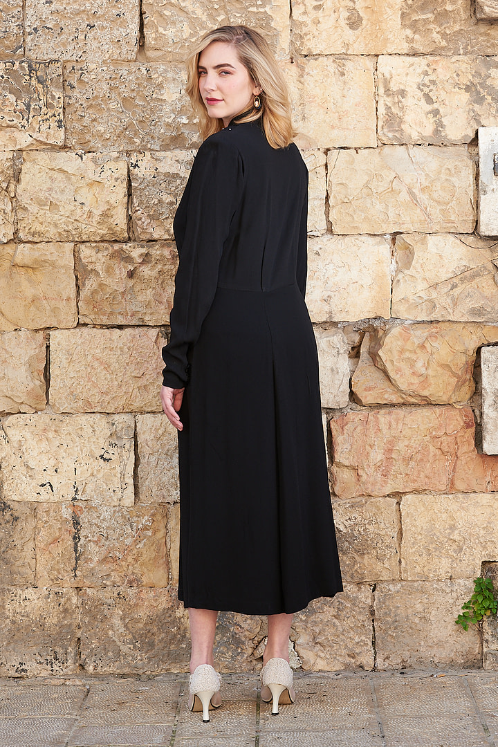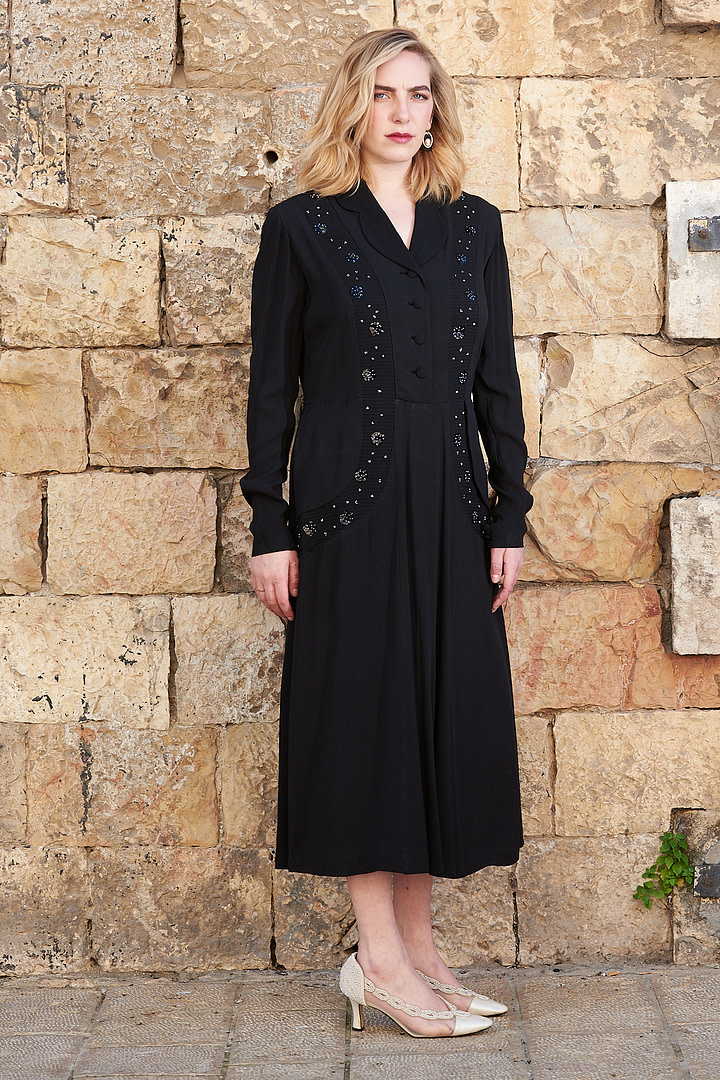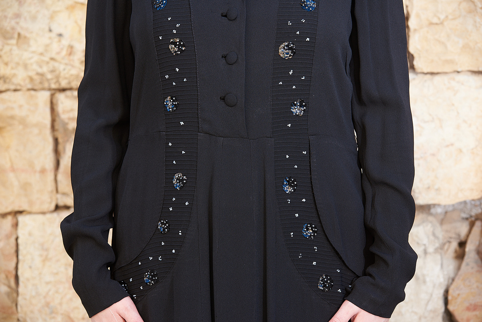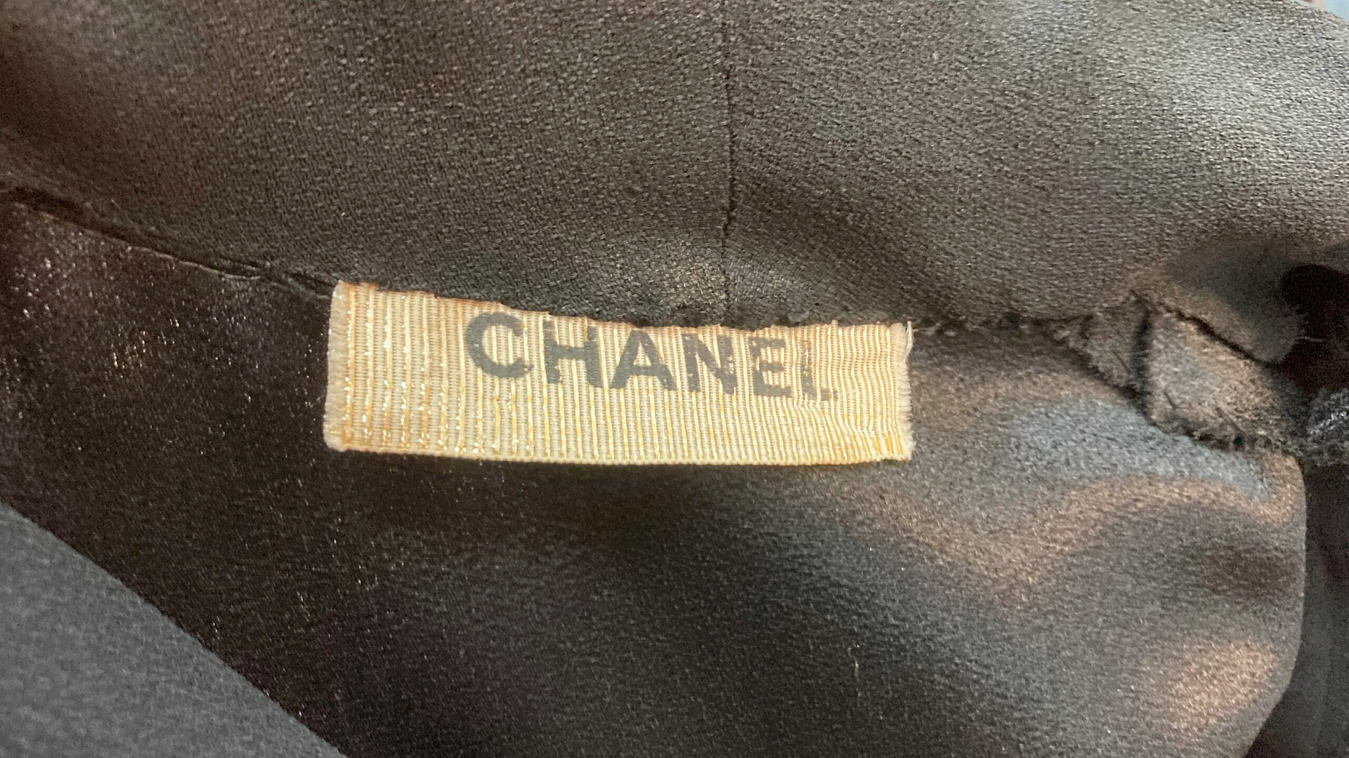 You’re not just investing in vintage apparel, you’re investing in history. This authentic 1950s label black Chanel dress is timeless in design and a staple to any wardrobe. Fitted bodice showcases different textures of black fabric. Braid trimming travels from the neckline in versatile versatility . The fitted skirt skims off the hips before flaring slightly for greater volume and movement as you walk or twirl.