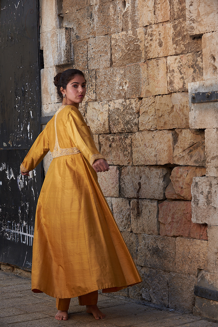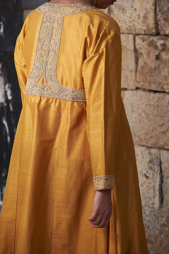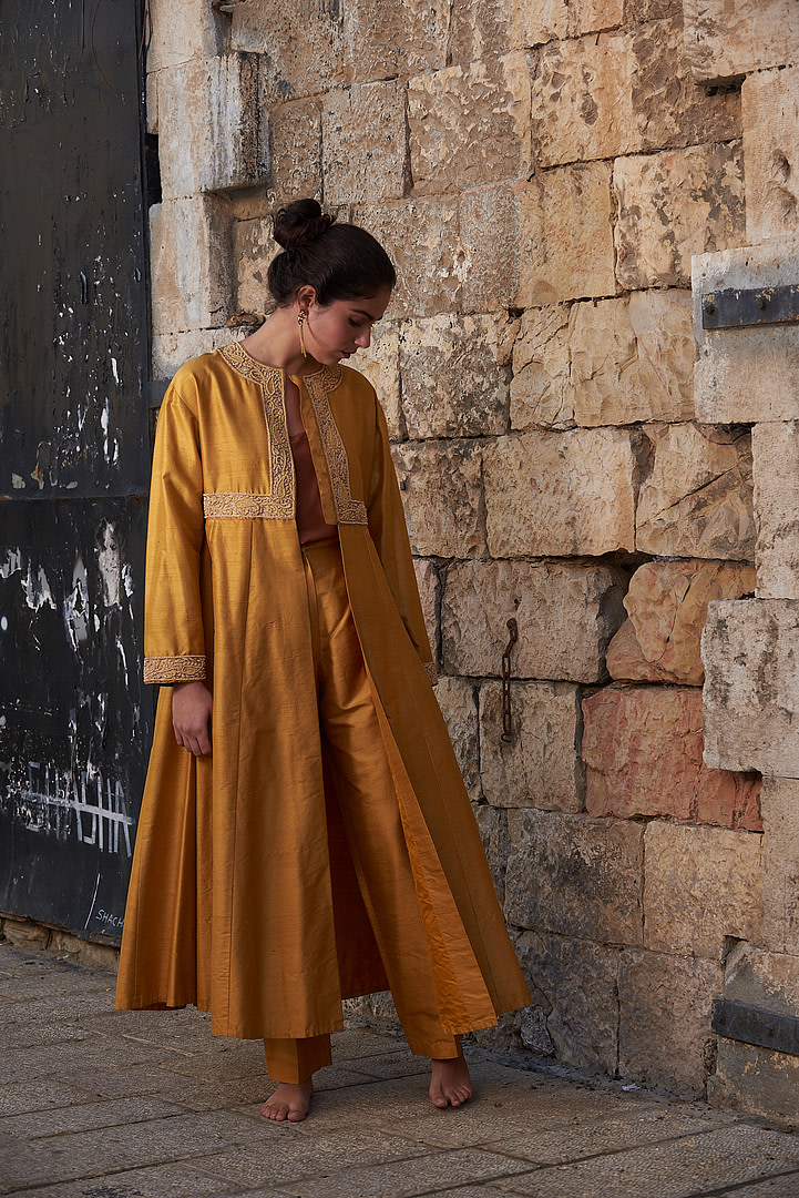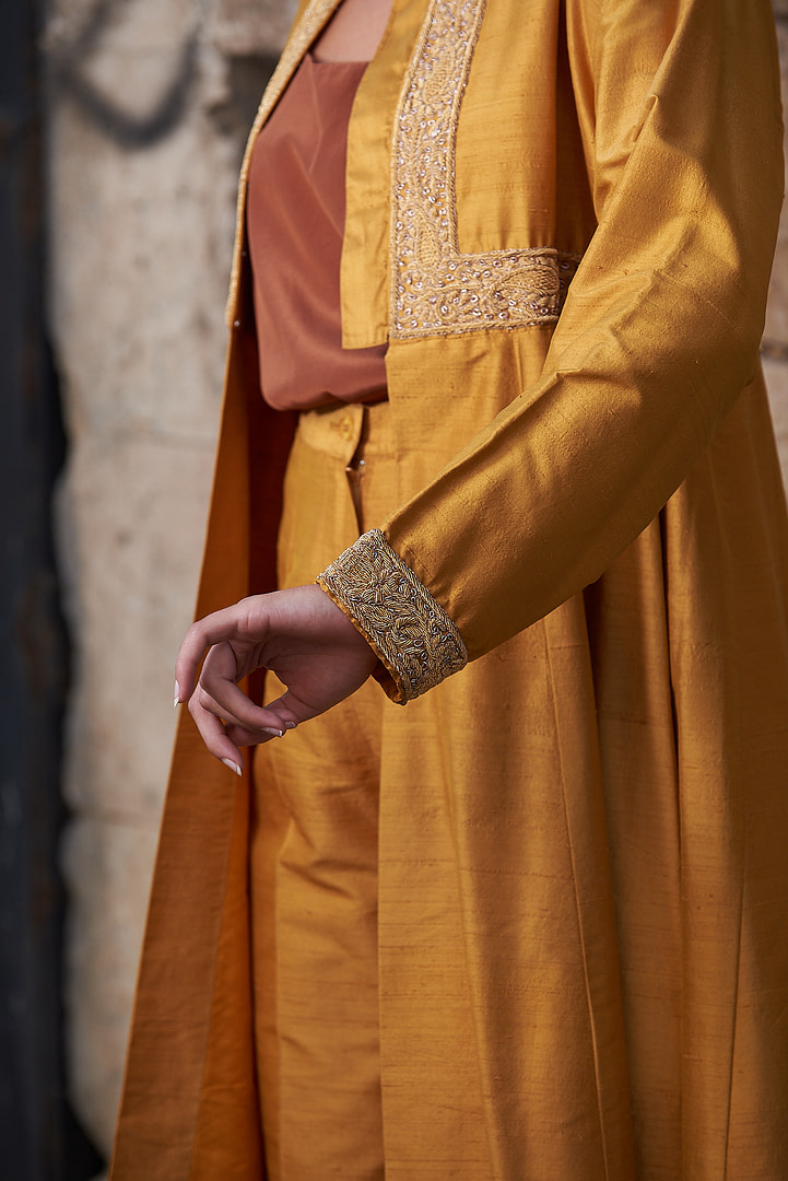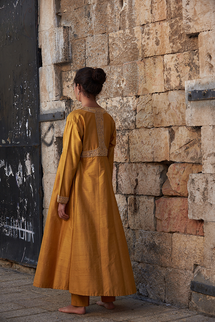 Grace Kelly, the legendary 1950’s movie star, commissioned this stunning bespoke orange tunic with matching pants, just for her trip to India. It is made in Italy from pure Shantung silk (wild silk), and features extensive hand embroidery emboldened with 24k gold applications. The ensemble consists of two parts–the tunic and the trousers–that are combined to form a dress-like outfit reminiscent of traditional Indian caftans and Mughal dresses. With its full, flowing fit and billowing long sleeves, this exquisite outfit is a piece of wearable art that will keep heads turning whenever you don it.