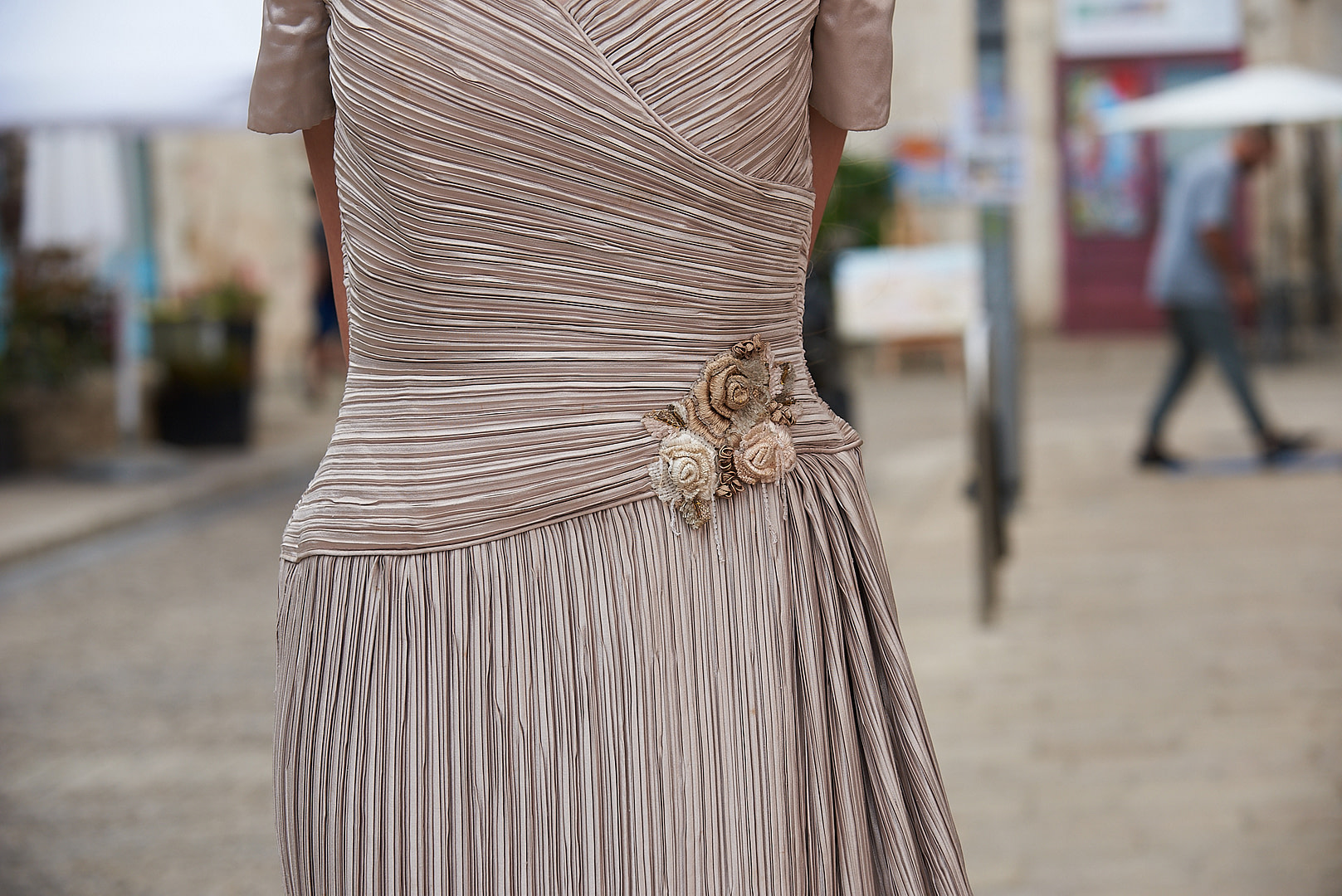 - Embroidered flower ornaments on waistline