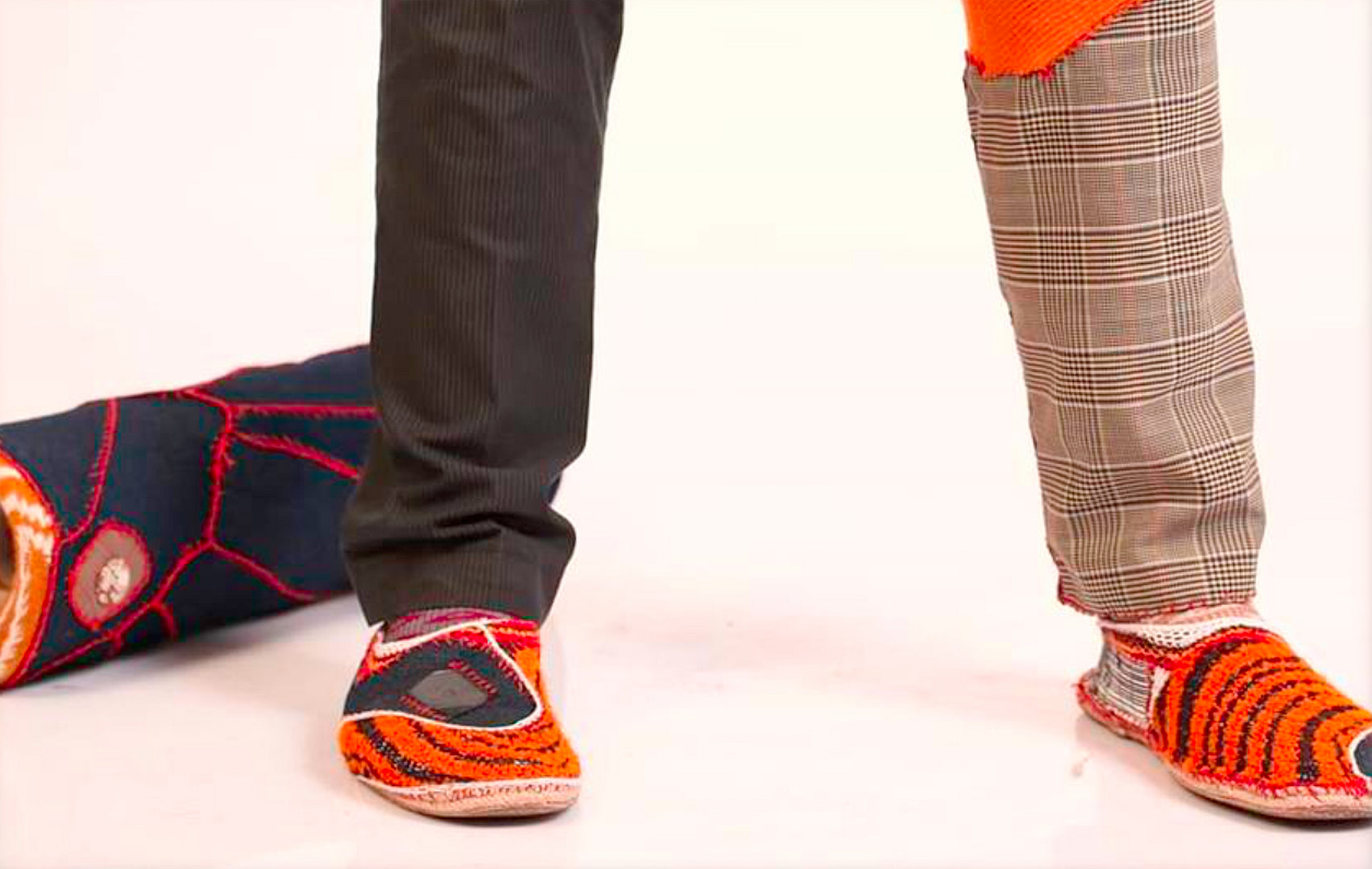 In terms of the design, we use a combination of contrasting fabrics, such as elastic and non-elastic knit, to create a unique and eye-catching composition. While each pair is unique, the same technique is used throughout, ensuring that each pair is both stylish and durable.