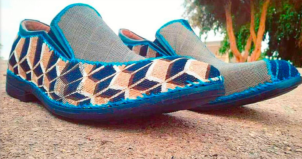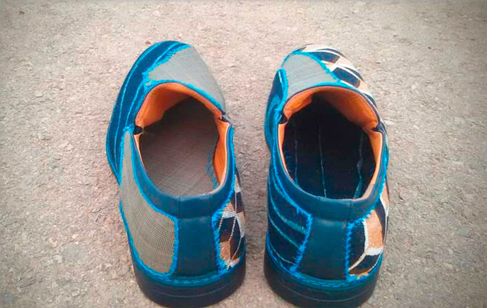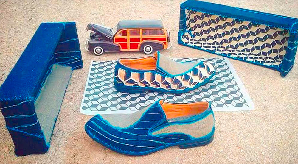 In 2016, Shay had the chance to create his own collection of Oxford shoes for a residency with Comme Il Faut at the Yafa port. This limited edition line included three pairs of leather-based upcycled oxfords that made use of a unique combination of hand sewing, machine knitting, natural cotton fabrics and geometric prints applied over jeans. The result is an elegant but bold look that manages to convey both organic and geometric patterns in one shoe.